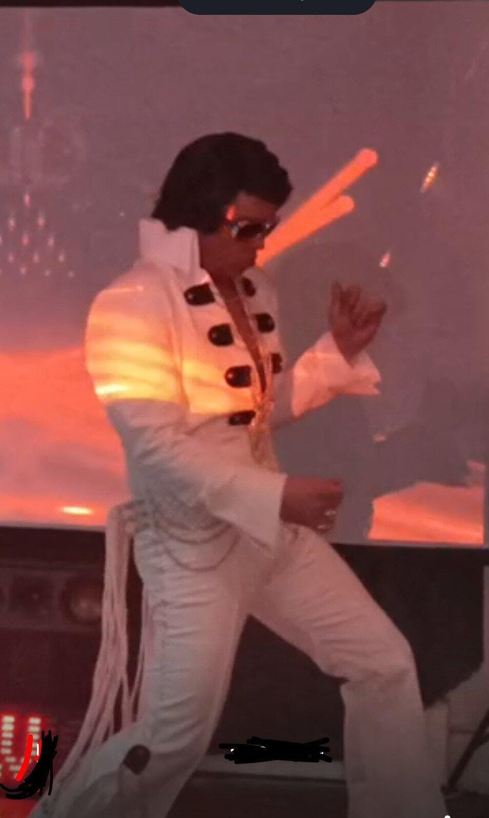A special note for this suit - Elvis's original Chain suit was made with gold chain and studs, but after some harsh treatment during cleaning, the gold "washed" away to show the silver coloured base metal!!